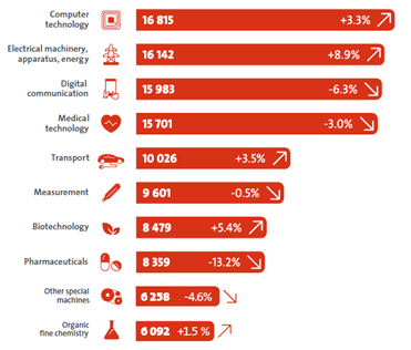 No sorprende constatar, porque así lo veníamos viendo en los últimos años, que los principales solicitantes de patentes europeas, a nivel mundial, durante 2024 han sido compañías tecnológicas y de telecomunicaciones, en particular, Samsung (Corea), Huawei (China), LG (Corea), Qualcomm (EE.UU.), RTX (EE.UU.), Siemens (Alemania), BASF (Alemania), Ericsson (Suecia) y Sony (Japón). Consecuentemente, durante el 2024 las invenciones relativas a las TIC (lo que en la jerga de patentes se denominan Computer Implemented Inventions (CII)) y relacionadas con la inteligencia artificial han sufrido un notable incremento, ascendiendo dos puestos en el ranking de campos tecnológicos en los que más patentes se presentan y colocándose en el número 1 de la lista. Otros campos técnicos, como maquinaria eléctrica y energía, transporte, biotecnología y química orgánica, también han experimentado un incremento durante 2024. Sin embargo, otros sectores como el de la comunicación digital, la tecnología médica o el sector farma, han sufrido una caída: