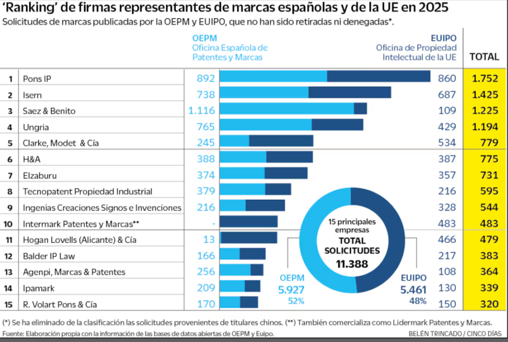 PONS IP lidera el ranking de solicitantes españoles de marcas en 2025, según Cinco Días